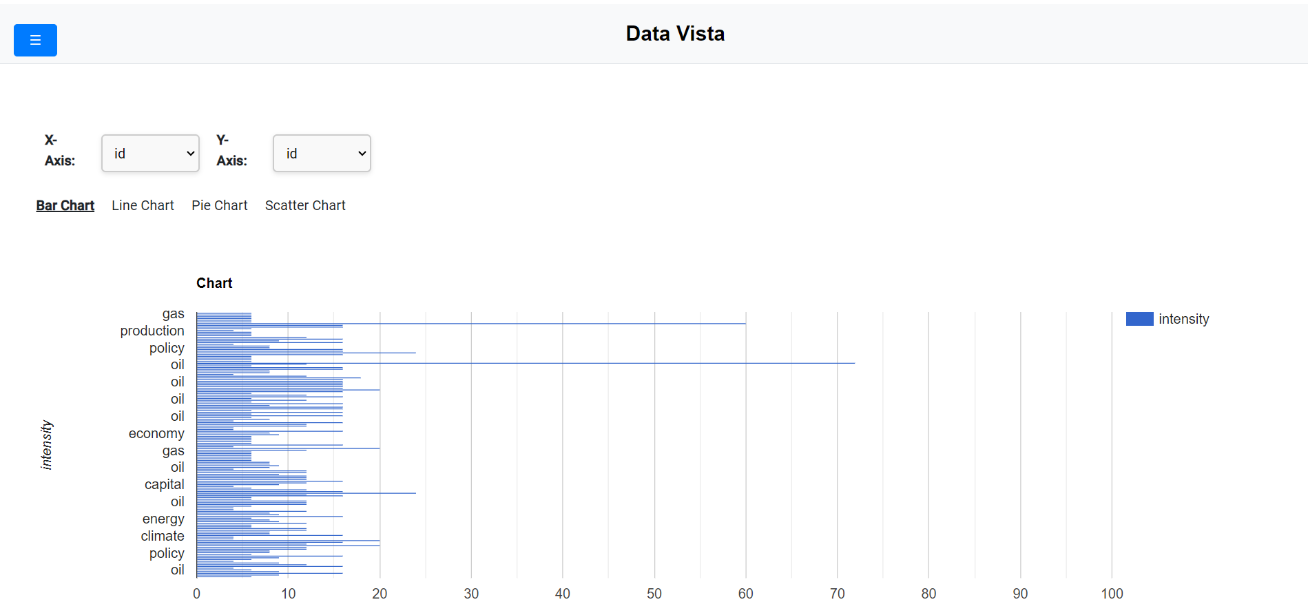 Introducing the Chart Visualizer, your go-to application for insightful data visualization powered by Angular, Google Charts, and Bootstrap. Seamlessly integrating with a backend built on Java, MongoDB, and Spring Boot, my application fetches and displays comprehensive data from an API, enabling you to visualize key variables such as Intensity, Likelihood, Relevance, Year, Country, Topics, Region, and City. With an attractive and user-friendly interface, the Chart Visualizer offers dynamic filtering options for end year, topics, sector, region, PEST, source, SWOT, country, and city, ensuring a customized and interactive experience. Technology stack, including MongoDB Cloud, Lombok, and Jenkins, for a robust and efficient solution to analysis needs. Please ClickHereto explore the live project .