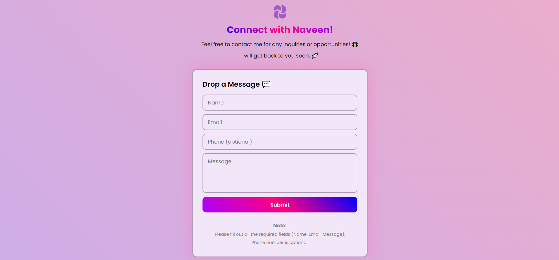 Connect with me easily using this contact form built with React. Powered by EmailJS, it ensures a quick and reliable way to get in touch. Feel free to drop me a message or inquiry. Please ClickHereto explore the live project .